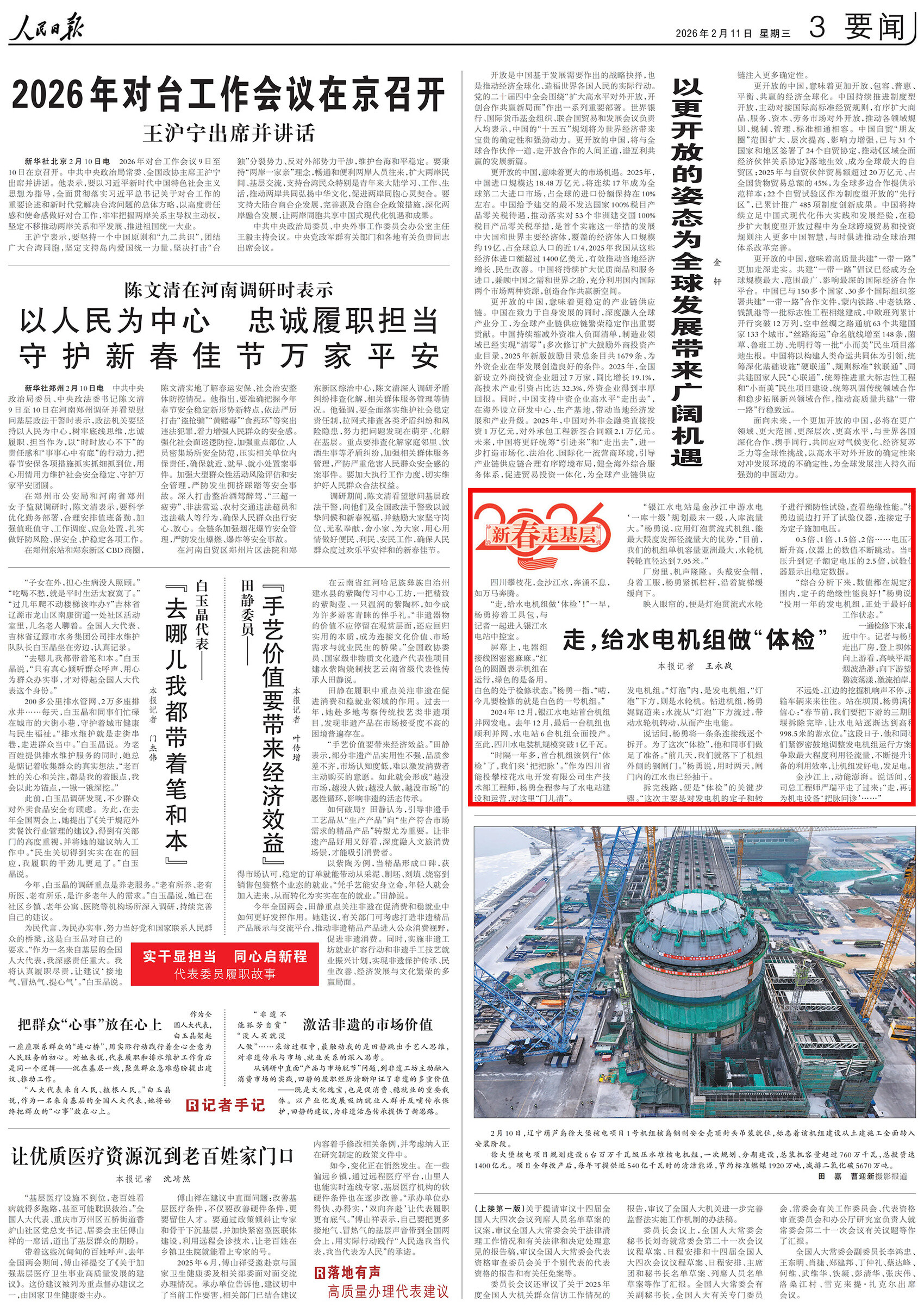 不远处,江边的挖掘机响声不停,运输车辆来来往往。站在坝顶,杨勇满怀信心:“春节前,我们要把下游的三期围堰拆除完毕,让水电站逐渐达到高程998.5米的蓄水位。”这段日子,他和同事们紧锣密鼓地调整发电机组运行方案,争取最大程度利用径流量,不断提升设备的利用效率,让机组发好电,发足电。