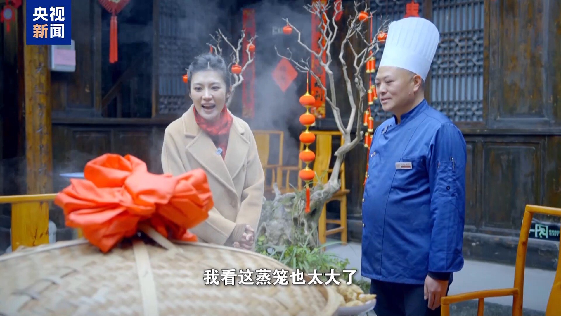 厨师 高正勇:这个蒸笼直径1.2米,蒸起来透气、不滴水,保持了菜品的原味。用竹编的蒸笼,菜也融入了竹香味。