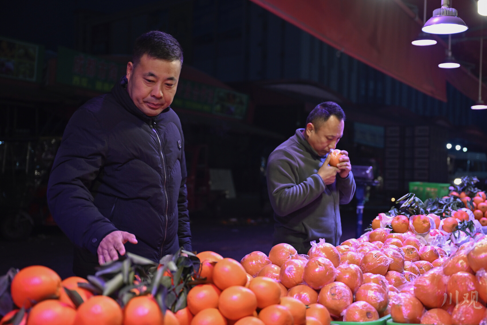年饭年年吃,今年有不同。吃过饭的李红维拉着搭档刘红军,在一旁的集市上,摆摊卖起了水果,陕西的苹果、眉山的果冻橙,这些货运路上的原产地蔬果,是他们增收的新门道。
