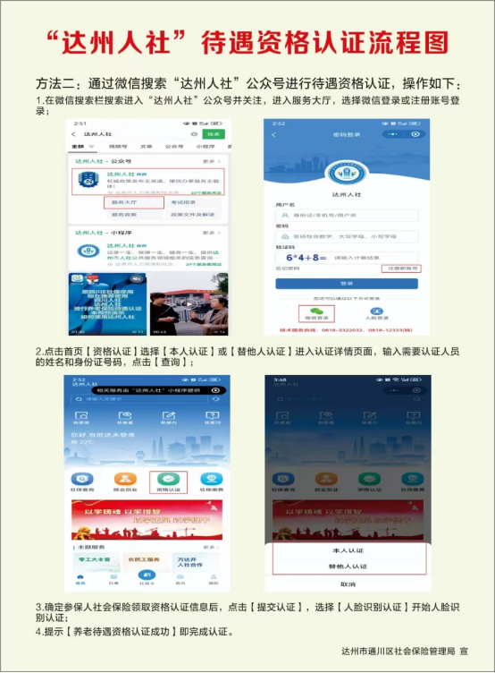 2.微信小程序“达州人社”:1.关注达州人社公众号;2.点击首页资格认证;3.选择本人认证或替他人认证;4.点击提交认证,选择人脸识别认证开始人脸识别认证;5.页面提示养老待遇资格认证成功。