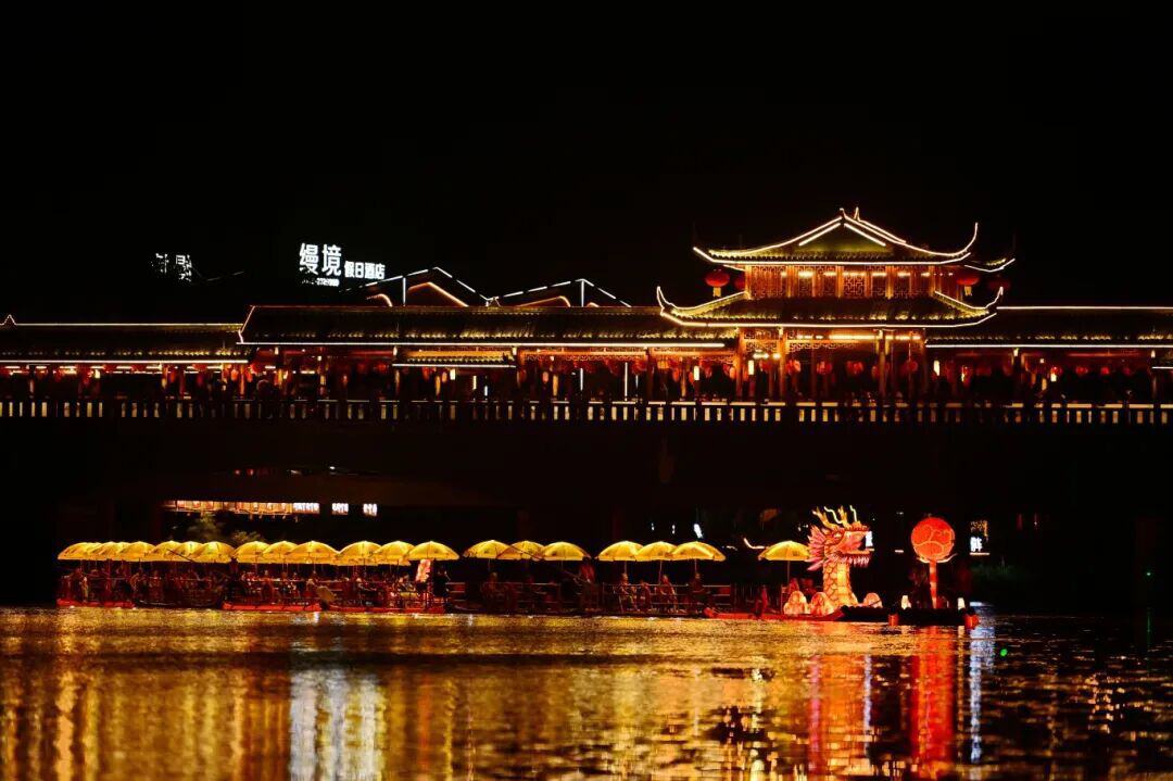 当夜幕缓缓降下,苏稽古镇人头攒动。峨眉河畔,人声鼎沸。1600℃的铁水腾空而起,化作漫天星火,在《峨眉山月》的悠扬旋律中,为游客呈现出一幅“火树银花落,万点星辰开”的水乡画卷。古镇核心区内,身着古装的NPC穿梭派福,游客通过猜灯谜、美食闯关赢取“乐游币”,兑换跷脚牛肉、甜皮鸭等美食。从廊桥的启灯仪式到茹公桥的鱼灯巡游,从古戏台的川剧变脸到街巷的市井游园,“游、赏、吃、玩、兑”全场景体验让游客流连忘返。