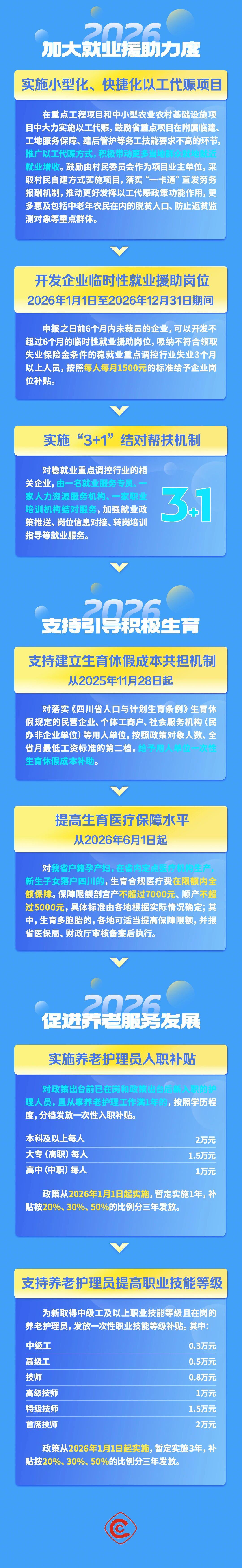 注重挖潜拓新。在拓展就业岗位方面,《政策措施》特别注重在新竣工投产企业和新兴领域企业拓展就业增量。比如,对2026年期间新竣工投产企业,按招用人数分档给予企业招工激励,单户企业最高不超过100万元;对文化、体育、旅游、养老、托育和数字经济等领域的企业,2026年裁员率低、2027年用工人数增加,且稳定就业6个月以上的,根据用工人数分档给予企业扩岗奖补,最高奖补60万元。