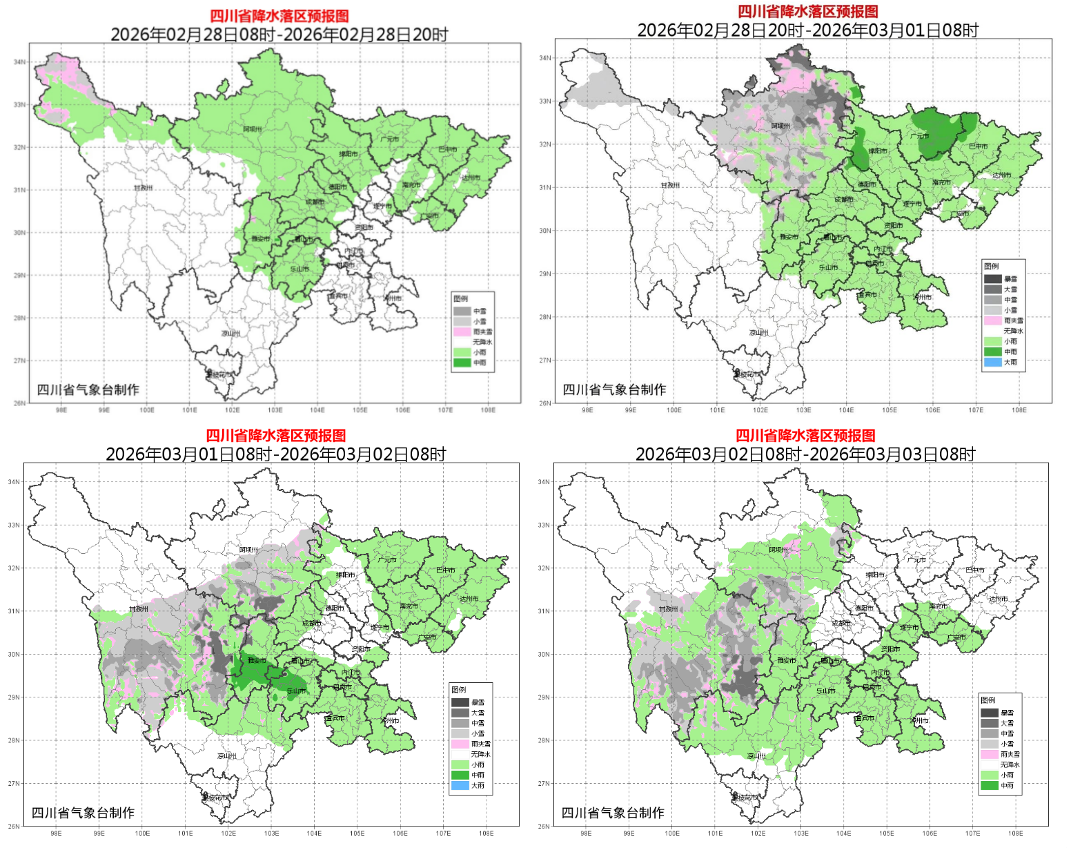 四川省气象台今天早间预报,2月28日至3月2日,盆地有一次降水天气过程,平均气温略有下降;川西高原和凉山州北部有阵雪或阵雨,局地中到大雪,需防范雨雪天气和道路结冰带来的不利影响。