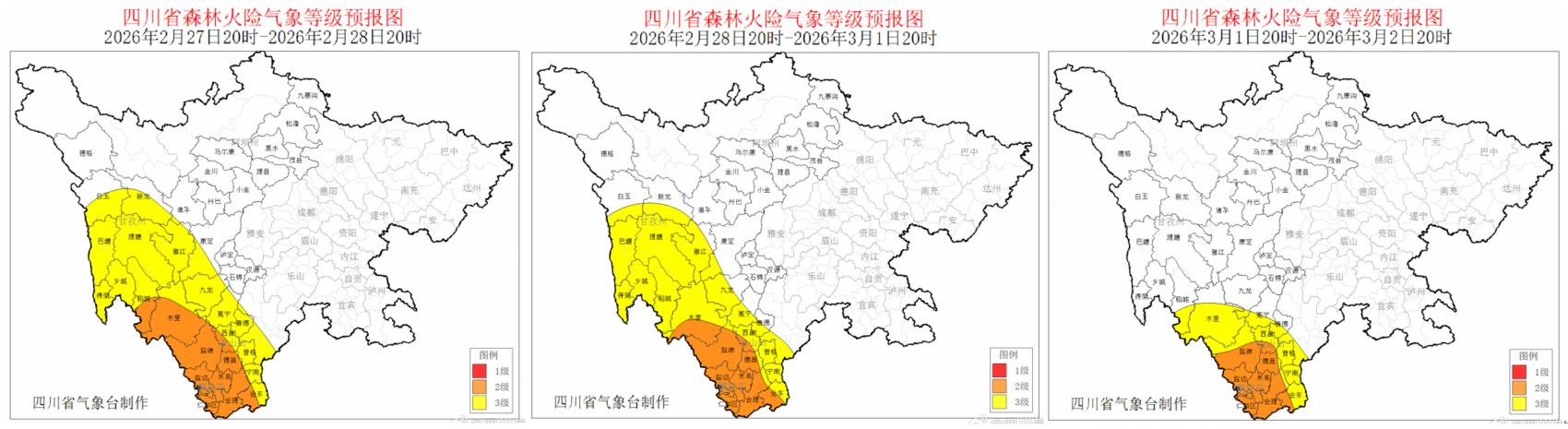 四川省气象台提醒,2月28日至3月1日20时甘孜州中部南部和攀西地区大部、3月1日20时至3月2日20时攀西地区大部多云间晴,午后到傍晚风力较大,森林草原火险气象等级为3级,局部可达2级,需加强火源管理和森林防火工作。