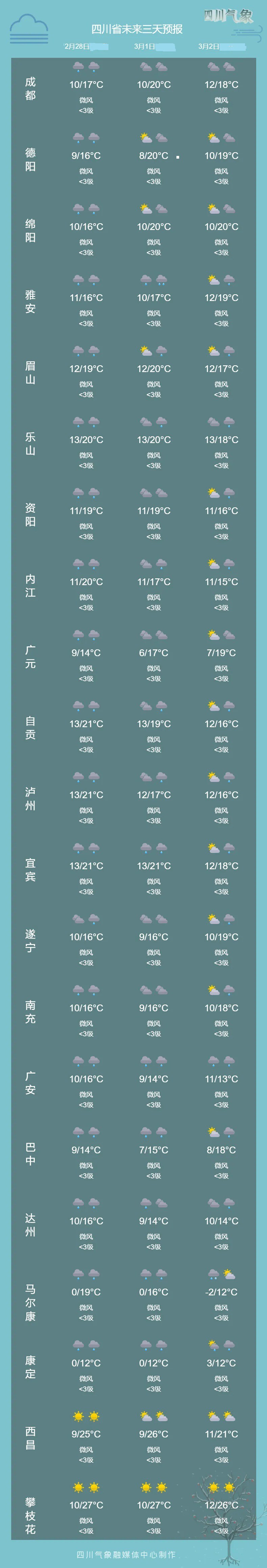3月1日白天到晚上,盆地各市阴天间多云,大部地方有小雨,西南部局部有中雨;阿坝州东部南部、甘孜州中部南部和凉山州北部阴天间多云有阵雪或阵雨,局地中到大雪,川西高原和攀西地区的其余地方多云间晴。