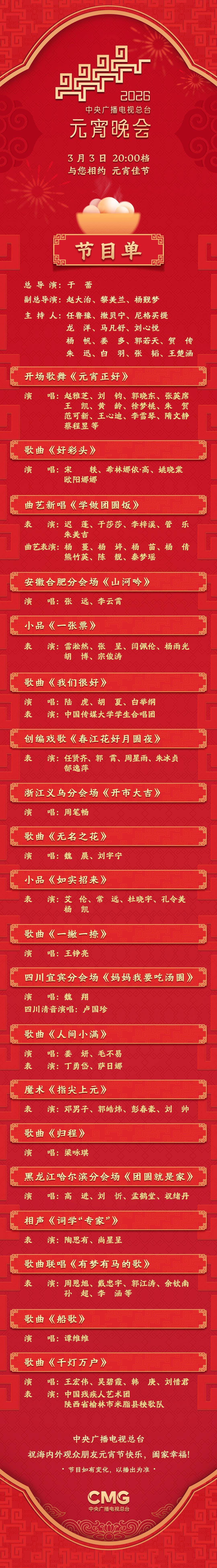 今晚8点档,中央广播电视总台《2026年元宵晚会》将在央视综合频道(CCTV-1)、综艺频道(CCTV-3)、中文国际频道(CCTV-4)、戏曲频道(CCTV-11)、音乐频道(CCTV-15)以及4K超高清频道、8K超高清频道等电视频道,音乐之声、经典音乐广播、文艺之声、大湾区之声、台海之声、华语环球广播、南海之声等广播频率,央视新闻、央视频、云听客户端和央视网、央广网、国际在线等新媒体平台同步播出,陪伴全球华人和海外朋友共度团圆喜乐、温馨和美的元宵佳节!