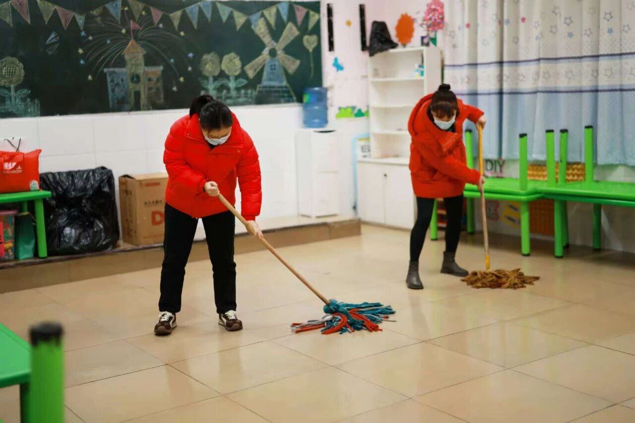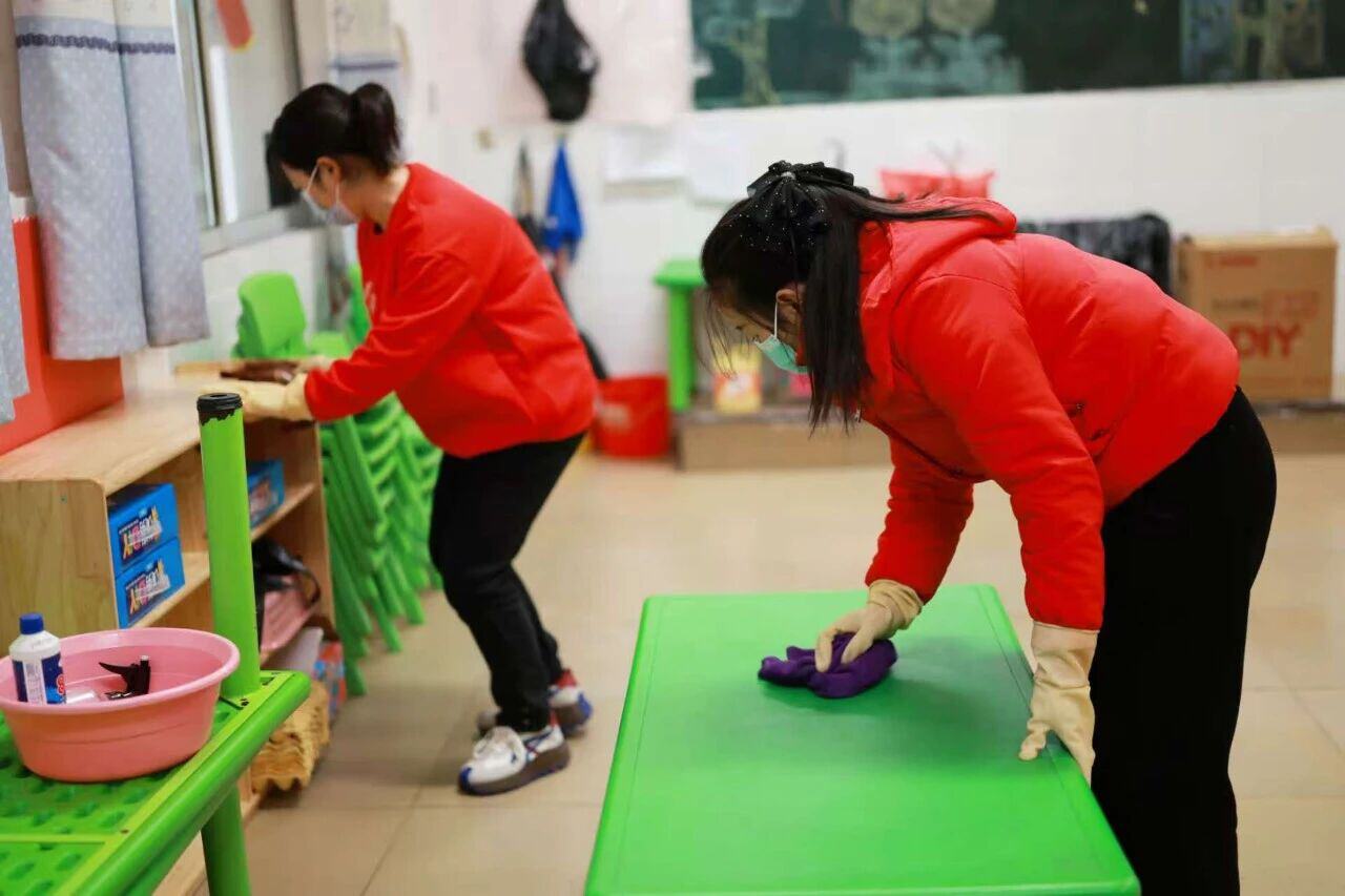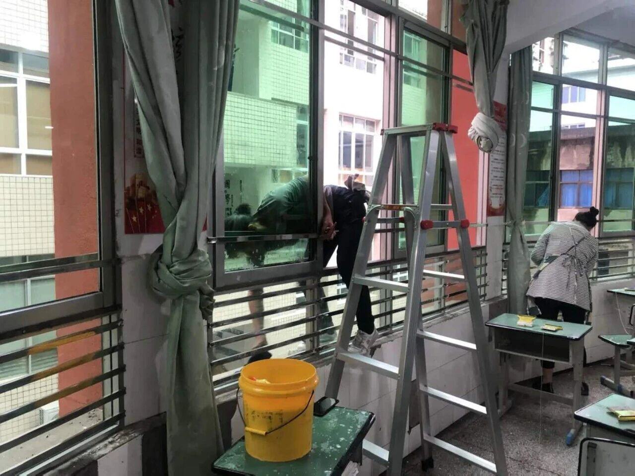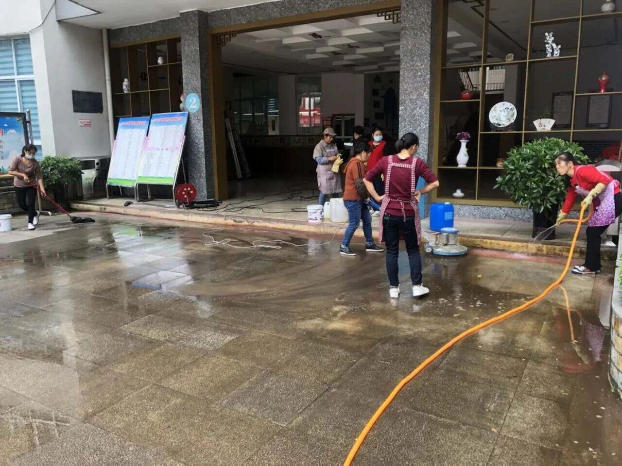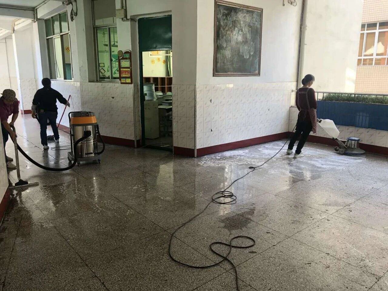 体卫艺保洁团队和食堂工作人员对校园开展深度清洁与专业消杀。教室、办公室、走廊、卫生间、食堂、功能室等区域全面清扫,清除卫生死角;对门把手、课桌椅、扶手、水龙头等高频接触部位重点消毒;食堂严格执行食品安全规范,彻底清洗消毒厨具餐具、排查食材库存、规范留样流程,从业人员持证上岗、岗前培训到位,全力保障师生饮食安全与身体健康。