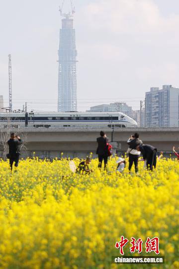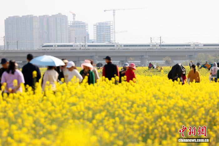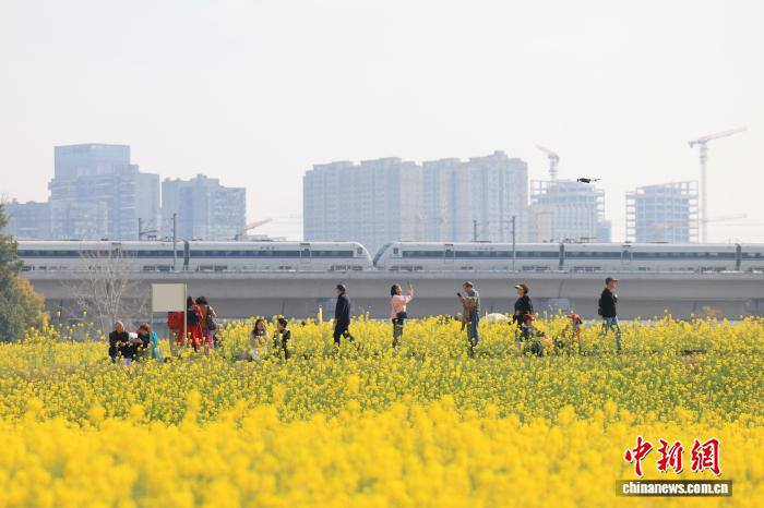 3月4日,列车从四川成都锦江大道一侧花海中穿过,吸引不少民众前来打卡。动车组列车与大片油菜花田同框出现,被市民称为“开往春天的列车”。中新社记者 张浪 摄