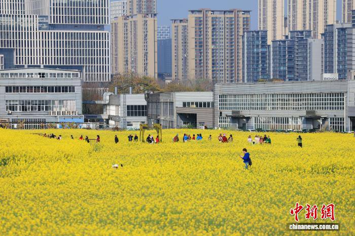 3月4日,初春时节,四川省成都市锦江大道一片油菜花海迎来最佳观赏时期,城市建筑与花海交相辉映,吸引市民打卡。中新社记者 张浪 摄