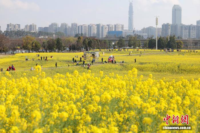 3月4日,初春时节,四川省成都市锦江大道一片油菜花海迎来最佳观赏时期,吸引市民打卡。中新社记者 张浪 摄