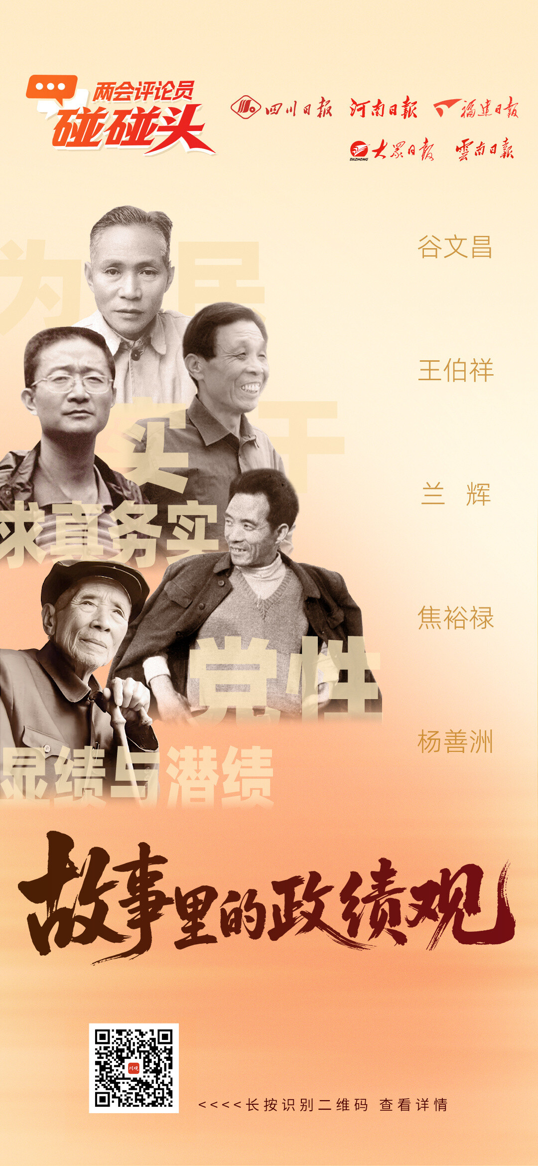 习近平总书记在参加他所在的十四届全国人大四次会议江苏代表团审议时强调,要认真组织开展树立和践行正确政绩观学习教育,引导广大党员干部落实“立党为公、为民造福、科学决策、真抓实干”总要求,创造经得起实践、人民、历史检验的实绩。围绕如何回答好“政绩为谁而树、树什么样的政绩、靠什么树政绩”,本报联动河南日报、福建日报、大众日报、云南日报,重温兰辉、焦裕禄、谷文昌、王伯祥、杨善洲五位典型人物的事迹,评述“党员干部该有怎样的政绩观”,敬请垂注。