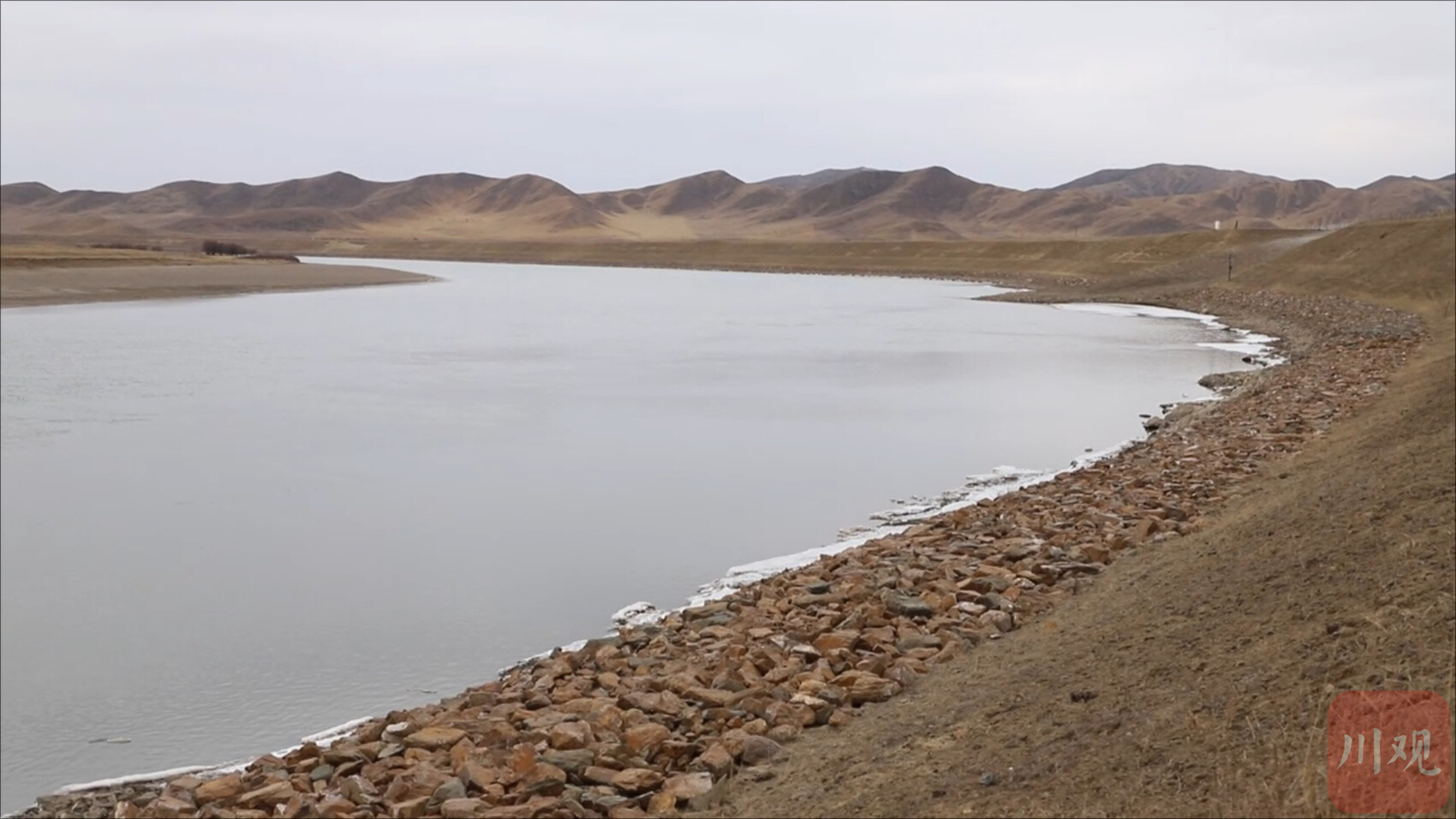 3月4日下午,记者跟随若尔盖县黄河护河队来到国道旁的唐克镇洛华湾观景点,只见黄河干流在此处180度掉头,形成一个巨大的回头弯。不远处的堤岸上,一个透明的玻璃展柜十分显眼。