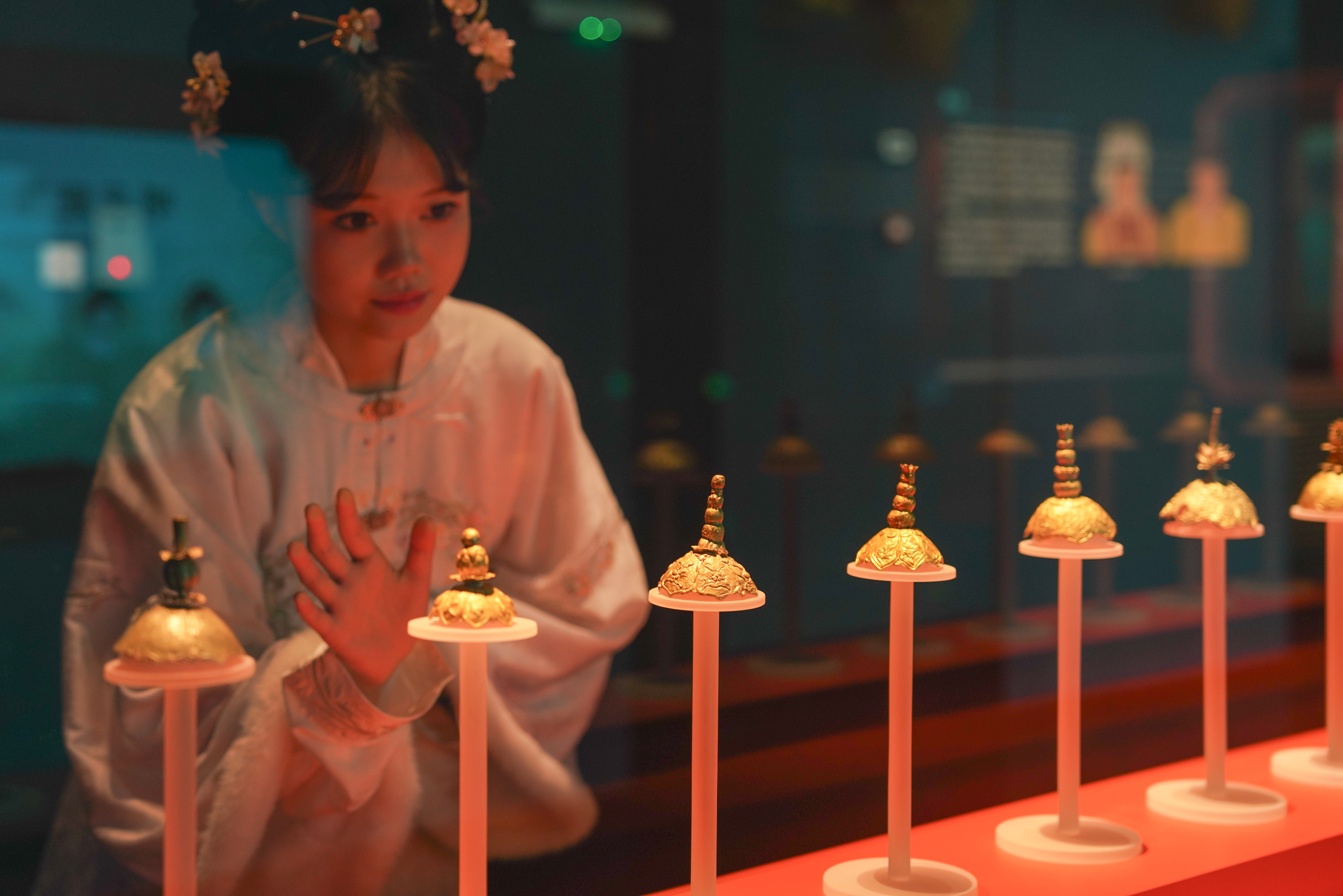 从“溢彩华韵”展区步入,明代服饰文化的华美画卷徐徐展开。精美的金银首饰、玲珑纽扣、带銙佩饰,让人仿佛穿越回那个衣必求贵、绮罗轻裘的时代。而在毗邻的明代商品贸易集市体验区,游客们正饶有兴致地与“NPC”货郎互动,或询问蜀锦市价,或品鉴茶叶冲泡技巧,欢笑声不绝于耳。