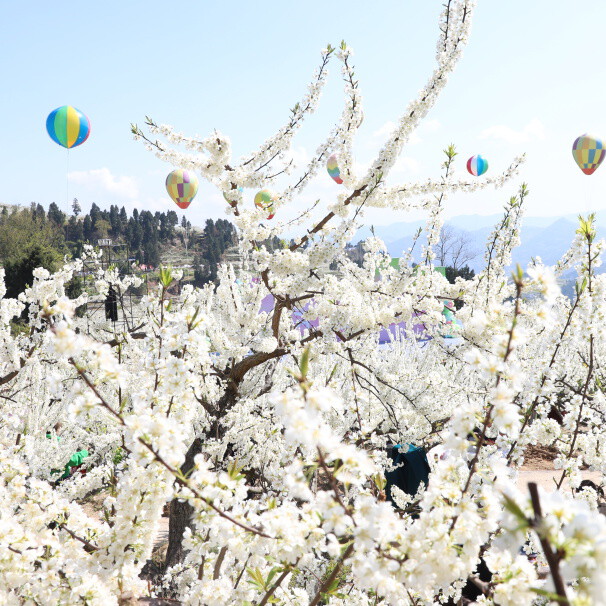 为提升游客体验感和沉浸感,活动现场还打造了多处氛围打卡点:李花主题秋千、“与春天合影”花墙、镂空打卡相框,以及点缀于树丛间的彩色热气球,为漫山遍野的白色李花增添了一抹亮丽色彩。