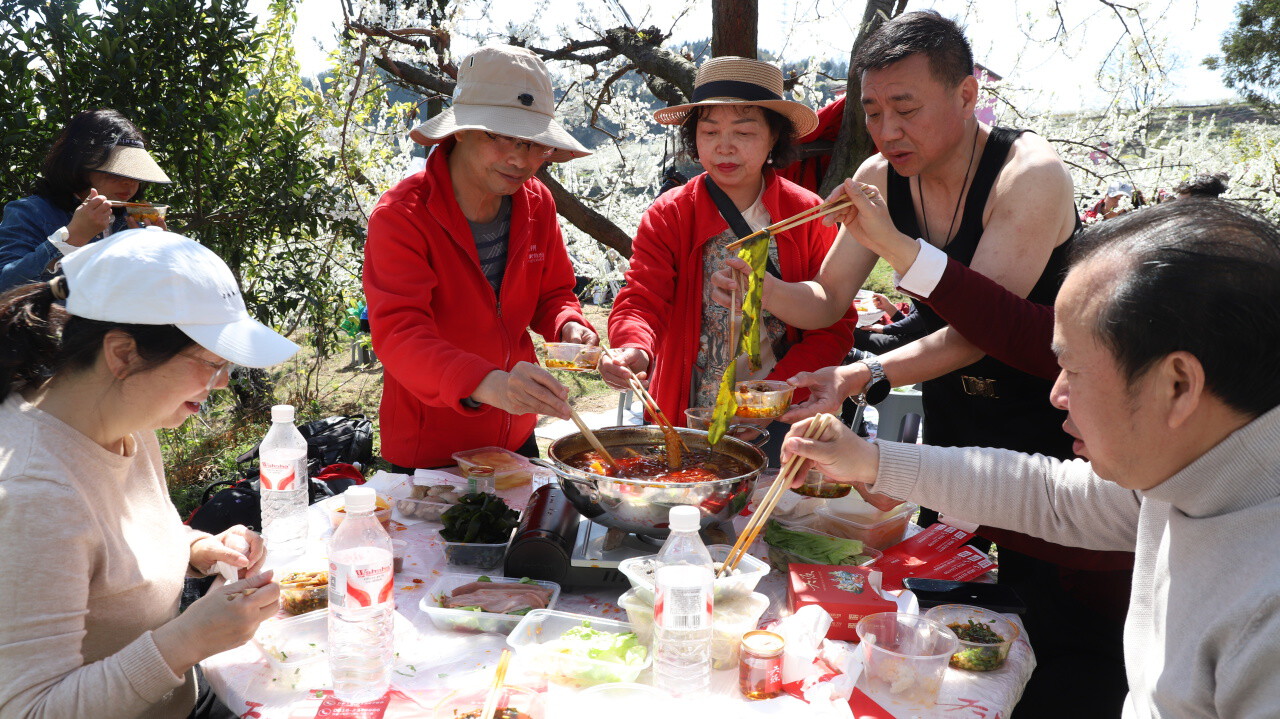 “第一次在花海里吃火锅,太有氛围感了!”从成都赶来的市民张女士难掩喜悦,“带着家人来感受这场花海音乐会,一边看漫山李花,一边听动听的音乐,还能体验采摘、吃火锅,这才是春天最美好的样子!一趟出行收获了多重快乐!”