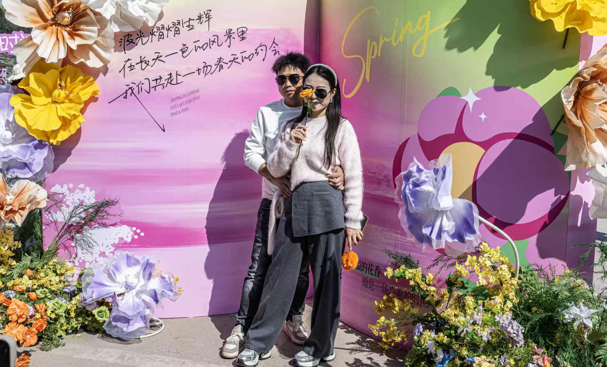 游客笑意盈盈,随乐摇摆、记录美好,掌声笑声在花间回荡