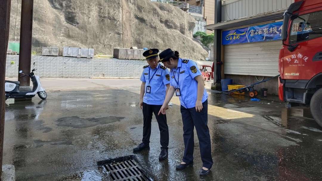 图为通川生态环境局执法人员现场检查好一新复兴批发市场商户产生的生产废水情况