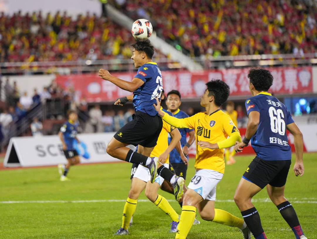 凉山队(蓝)球员头球争顶(徐湘东 摄)