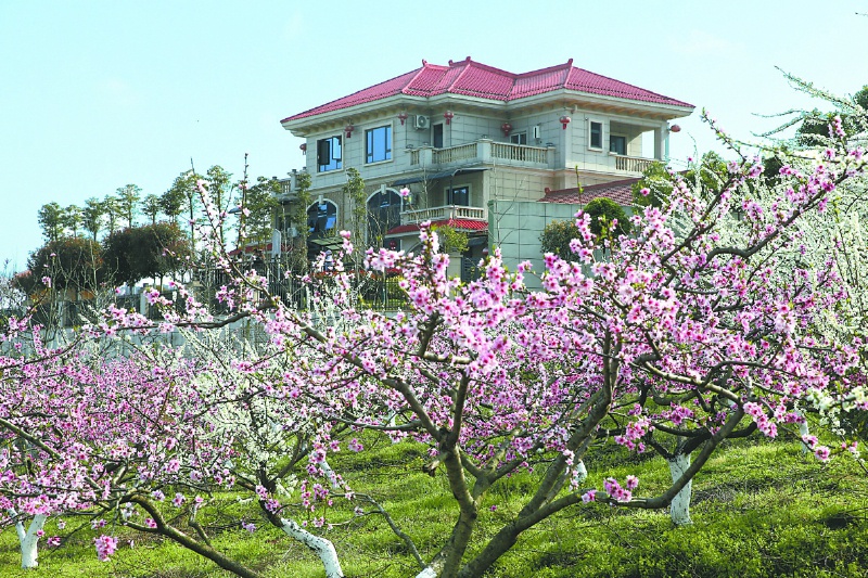 同样的春景,也在江南街道千佛岩村上演。果园里,洁白的李花与粉嫩的桃花次第绽放。游步道蜿蜒延伸,游客们徜徉其中,仿佛走进了一幅山水画。