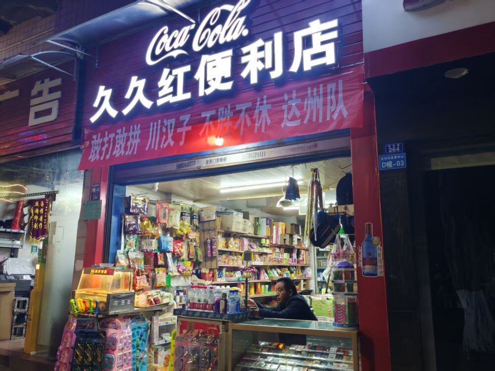 距离体育场不远的久久红便利店门口,挂着“敢打敢拼川汉子,不胜不休达州队”的标语。老板李先生笑着说,当晚生意“马马虎虎”“也就卖了四五千”,而平时这个时候,大约只有两千多。